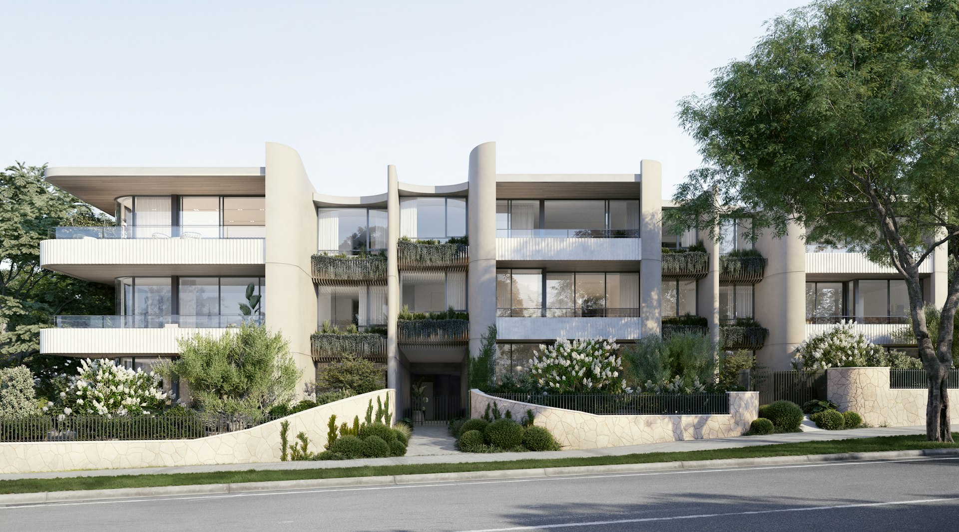The wide balcony forms a key feature of this upper-floor residence, creating an ideal place for sun salutations and coffee in the morning or a smooth wine in the evening. As the sun sets, watch the colours change across the landscape beyond and experience a precious sense of solitude.