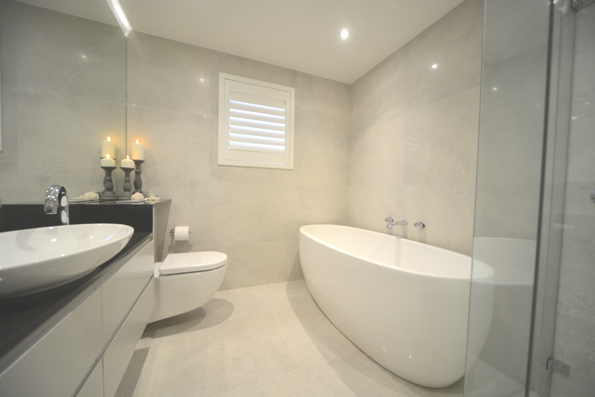 - Stylish full bathroom, standalone bath, tiled floor-to-ceiling